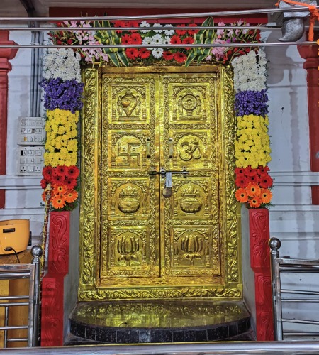 Custom-made Brass Temple Doors crafted in Pembarthy, Telangana. Ideal for temple entrances, pooja mandirs, & traditional architecture. Featuring intricate designs with embossed Hindu motifs and pure brass sheet metal work.