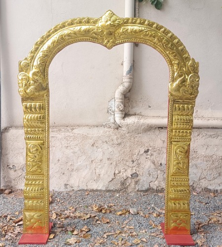Handcrafted Brass Makarathoranam from the skilled artisans of Pembarthy, perfect for temple entrances, pooja mandirs, and traditional South Indian decor. Intricate arch designs in pure brass.