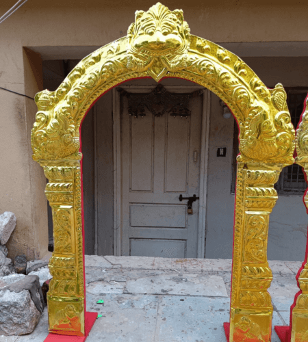 Our team can create traditional, antique, or gold-polished Makara thoranam to suit your temple or pooja room entrance.